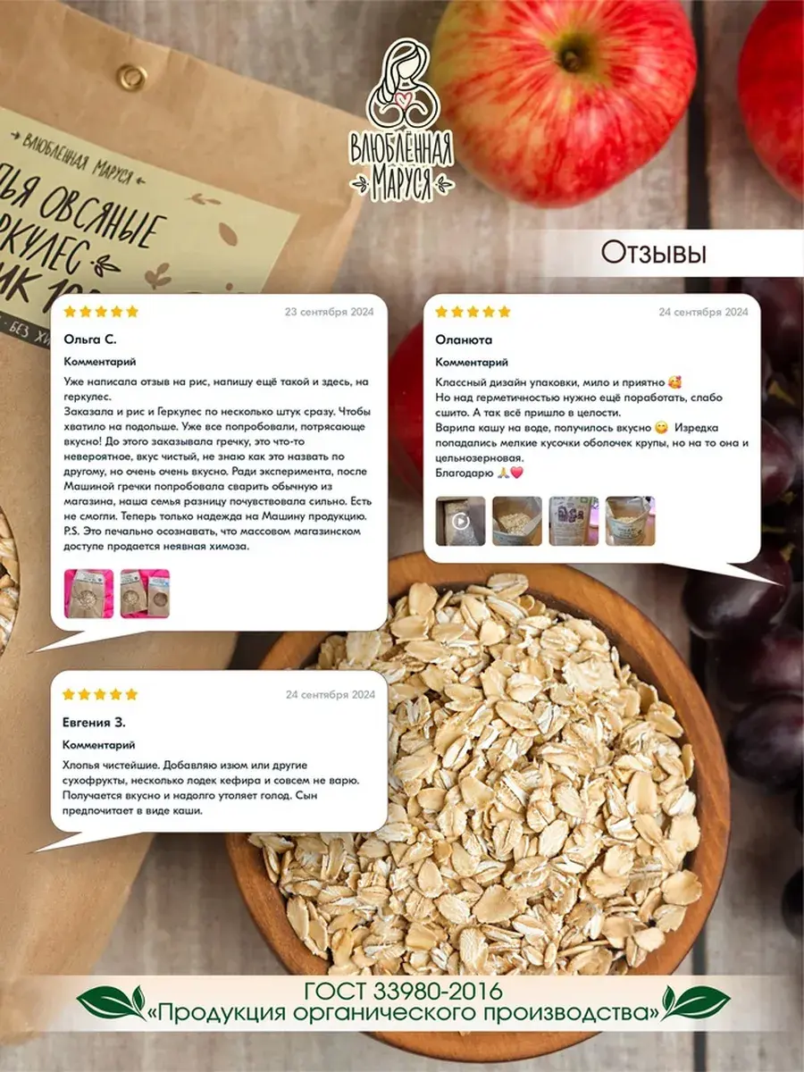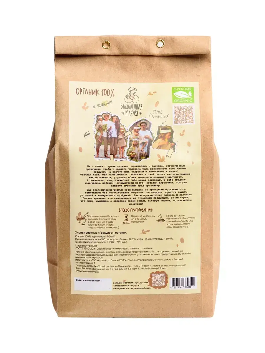 Геркулес «Влюбленная Маруся» - 100% чистый, органический продукт, подтвержденный сертификацией ORGANIC.