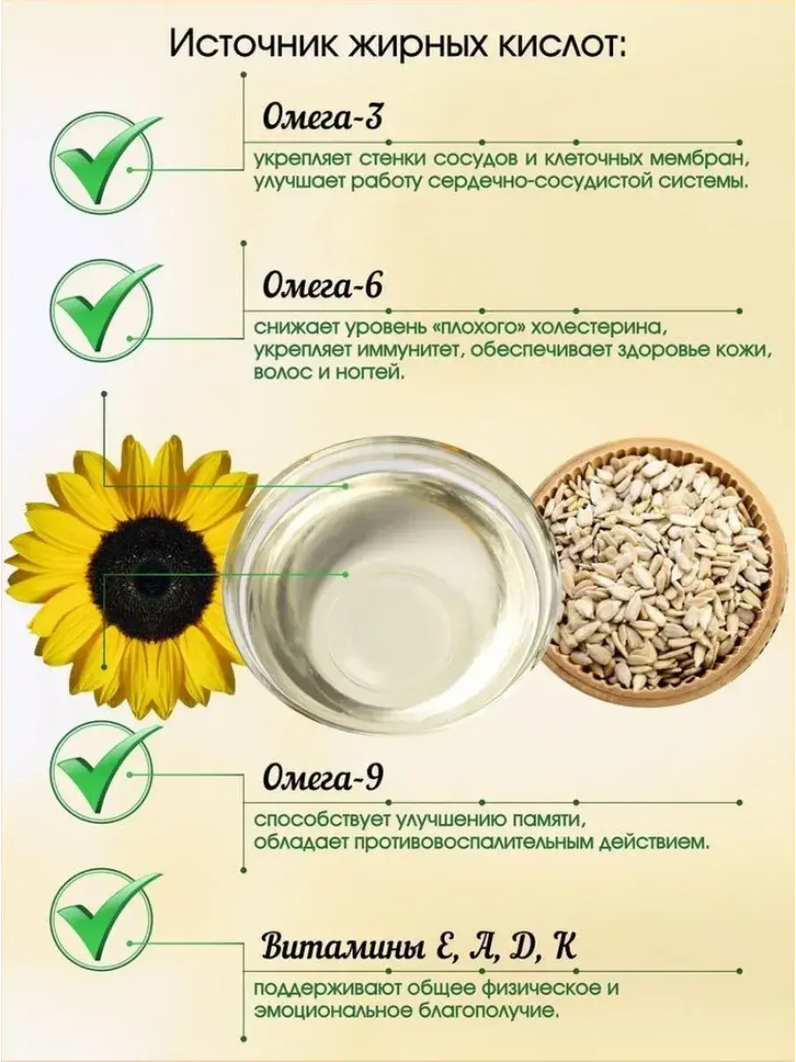 Универсальное применение: Наше масло идеально подходит не только для утреннего употребления, но и для кулинарии в целом. Используйте его для заправки салатов, добавления в соусы и даже в выпечку. Оно придаст вашим блюдам легкий и ненавязчивый вкус подсолнечника, который всем вам понравится!