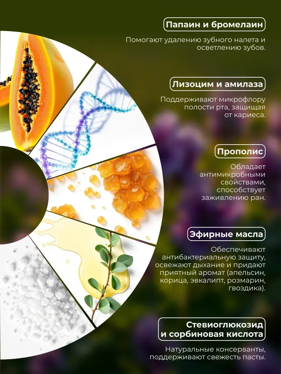 Состав: отвар шалфея лекарственного, ромашки аптечной, душицы обыкновенной, мяты перечной, кремнезем (диоксид кремния коллоидный), растительный глицерин, сорбитол, гидроксиапатит, саркозил (лауроилсаркозинат натрия), масло виноградной косточки, папаин, бромелаин, лизоцим, амилаза, прополис, натуральный ментол, ксантановая камедь, кокосульфат натрия, эфирное масло апельсина, эфирное масло корицы, эфирное масло эвкалипта, эфирное масло розмарина, эфирное масло гвоздики, стевиоглюкозид, сорбиновая кислота.