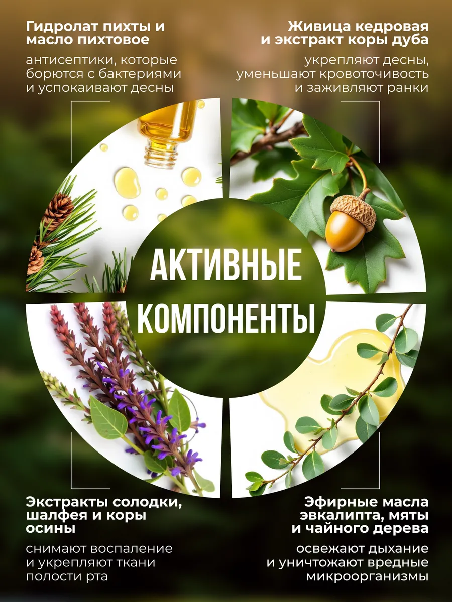 Состав зубной пасты: гидролат пихтовый, кремнезем (диоксид кремния коллоидный), живица кедровая, растительный глицерин, масло пихтовое, экстракт коры дуба, эфирное масло эвкалипта, ментол, экстракт солодки, экстракт коры осины, эфирное масло мяты, экстракт шалфея, масло кедровое, эфирное масло чайного дерева, гуаровая смола, саркозил (лауроилсаркозинат натрия), сорбиновая кислота.