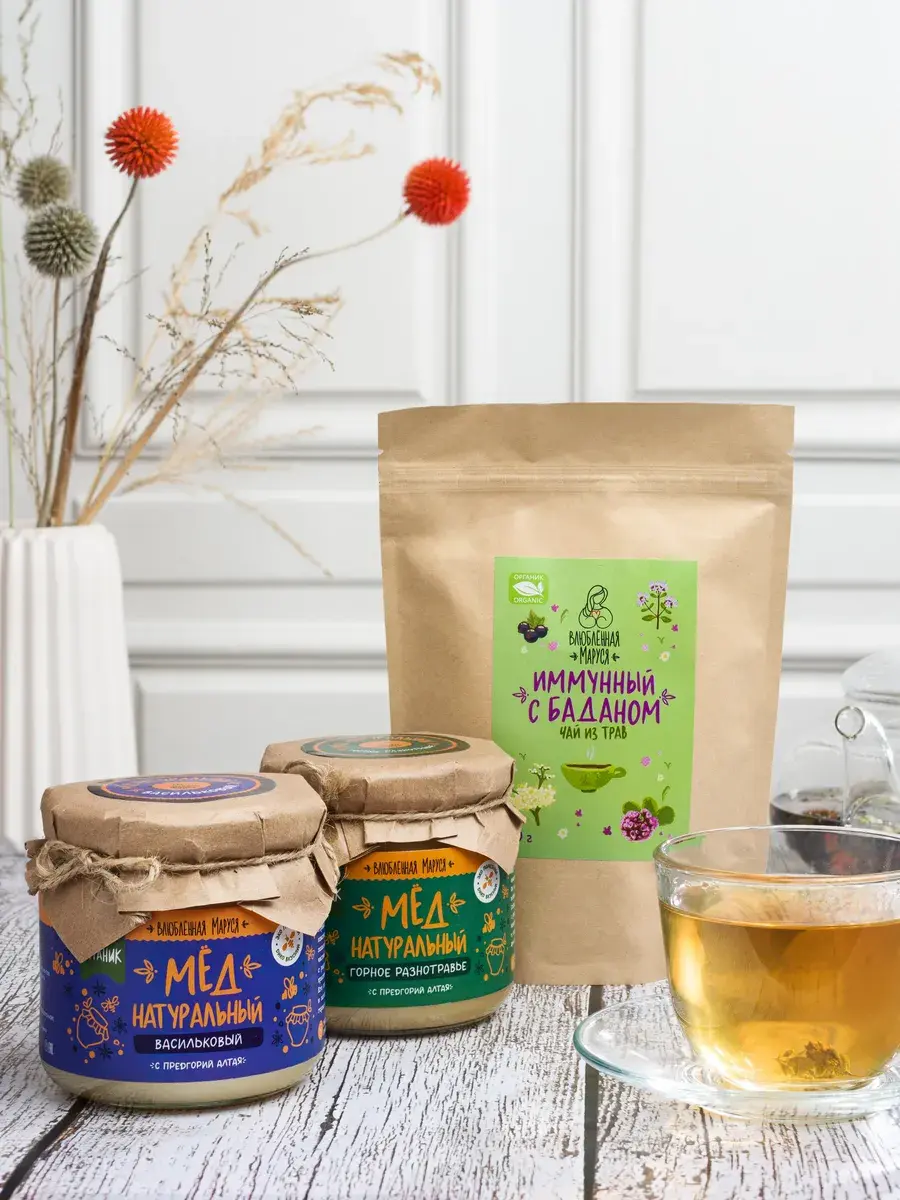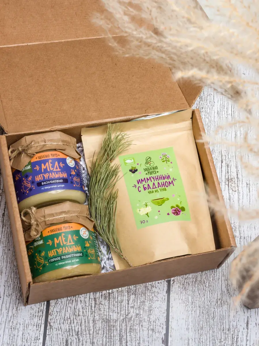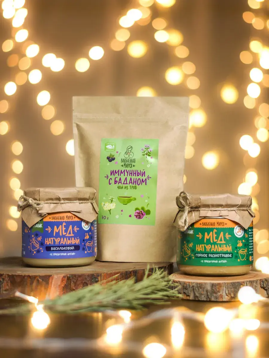 Иммунный чай с баданом, горный васильковый мёд и мёд «Горное разнотравие». Каждый компонент этого набора — это натуральный продукт, созданный с заботой о вашем здоровье.
