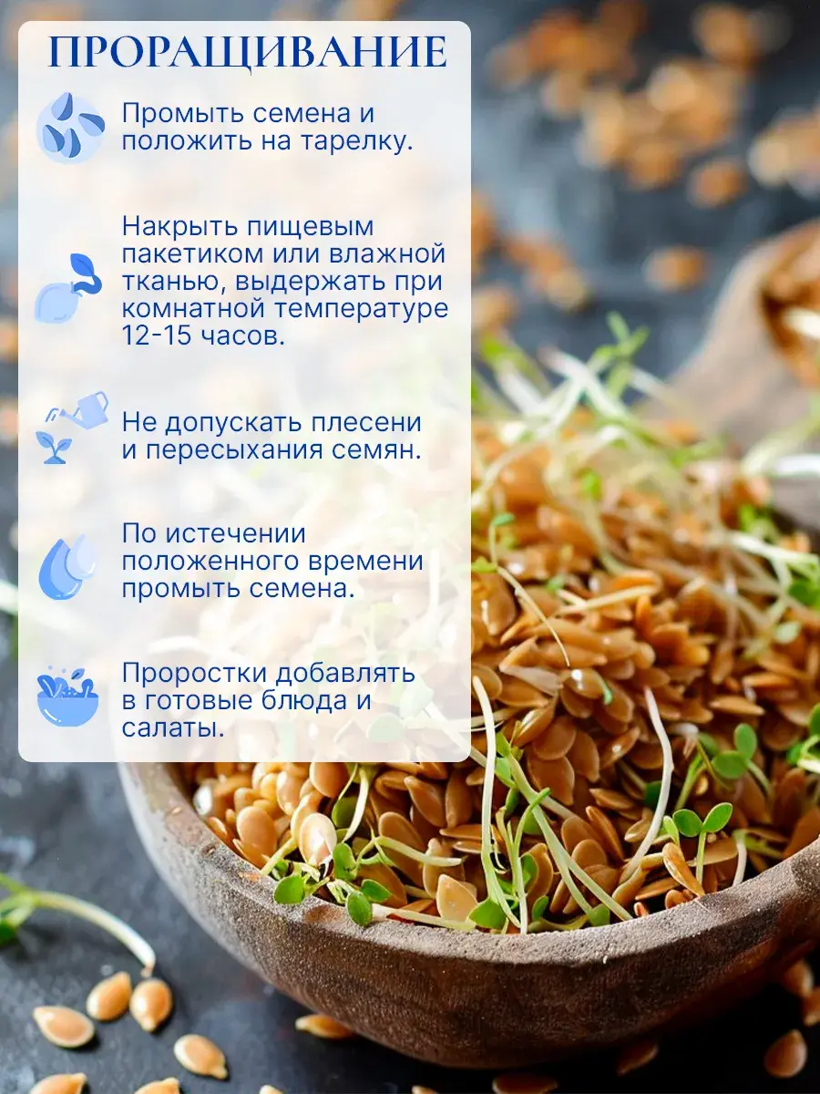 - Проращивание: промыть семена и положить на тарелку. Накрыть пищевым пакетиком или влажной тканью, выдержать при комнатной температуре 12-15 часов. Не допускать плесени и пересыхания семян. По истечении положенного времени промыть семена. Проростки добавлять в готовые блюда и салаты.