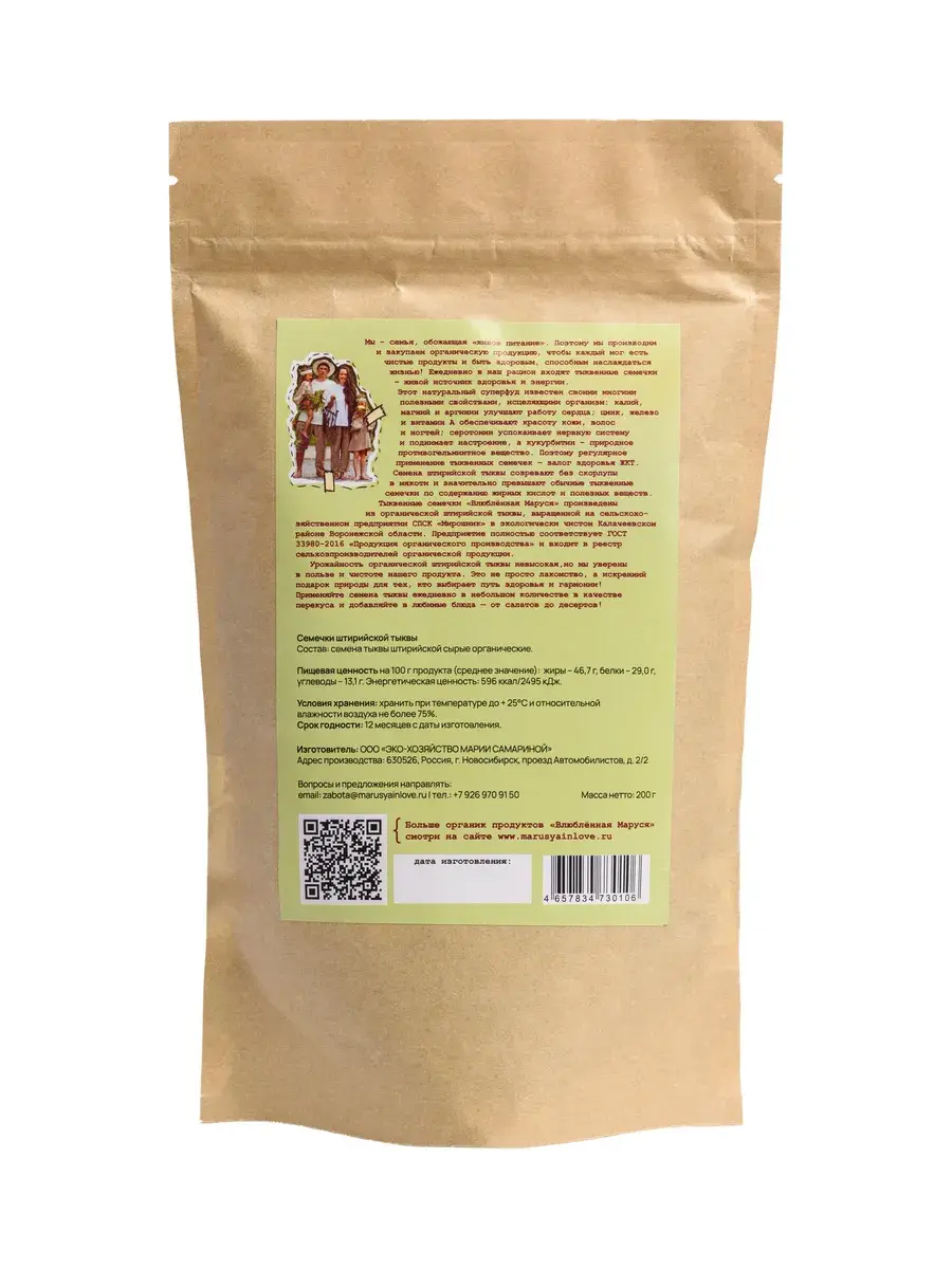 Произведены из огранической штирийской тыквы, выращенной на органическом сельско-хозяйственном предприятии СПСК «Мирошник» в экологически чистом Калачеевском районе Воронежской области. Предприятие соответствует ГОСТ 33980-2016 «Продукция органического производства» и состоит в реестре сельхозпроизводителей органической продукции.