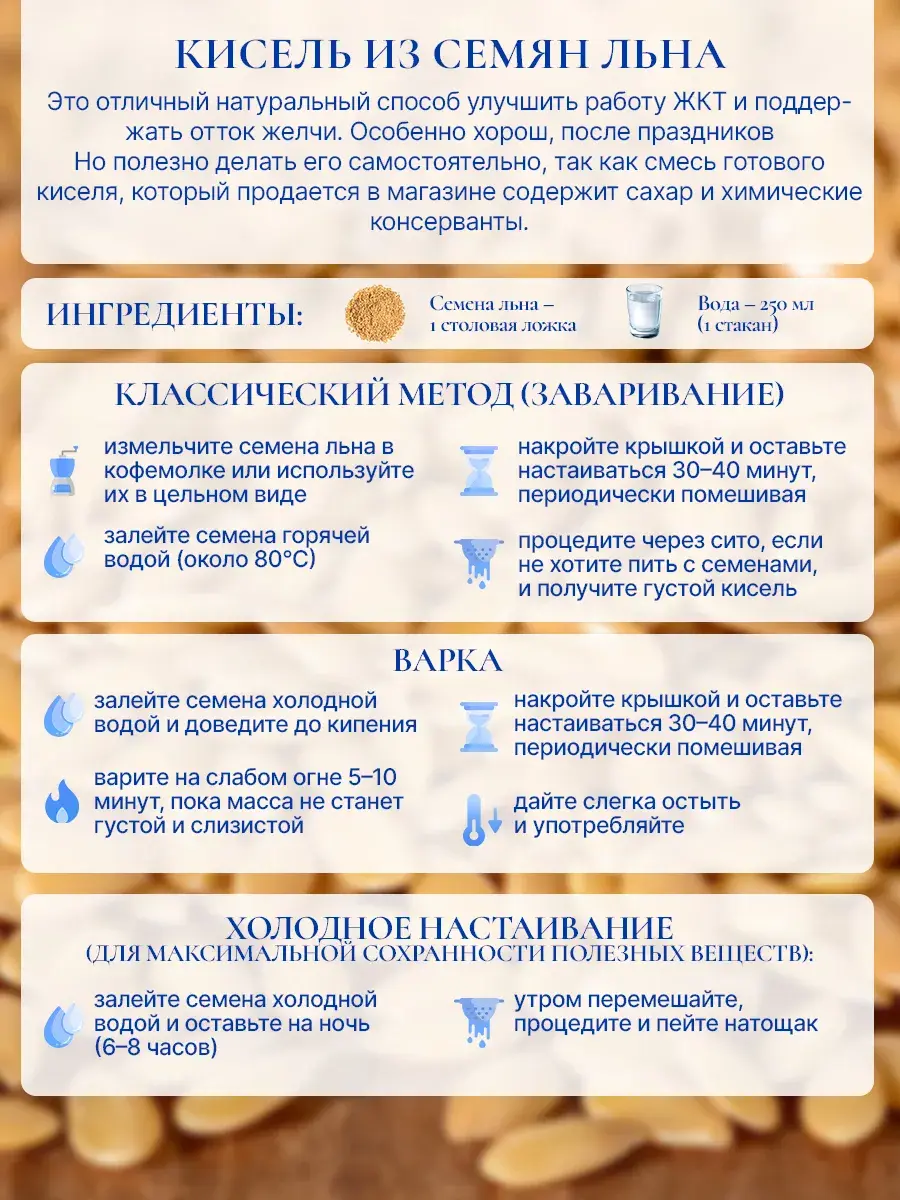 - Обволакивающий кисель для желудка: 1-2 ч. ложки промытых цельных или перемолотых семян льна залить 200 мл горячей воды, настоять 15-20 минут до появления слизи. Употребить кисель вместе с семенами.