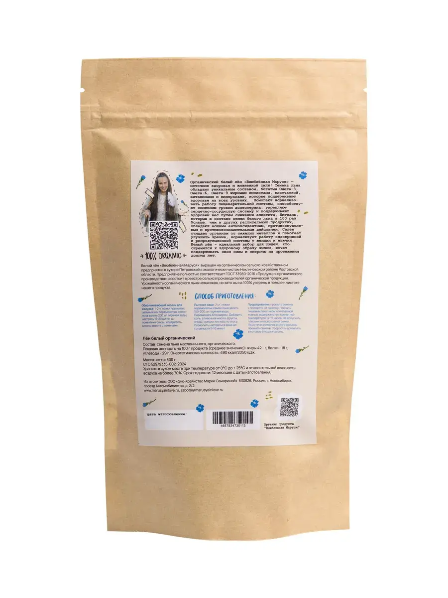 Белый лён «Влюблённая Маруся» выращен на органическом сельско-хозяйственном предприятии в хуторе Петровский в экологически чистом Неклиновском районе Ростовской области. Предприятие соответствует ГОСТ 33980-2016 «Продукция органического производства» и состоит в реестре сельхозпроизводителей органической продукции.