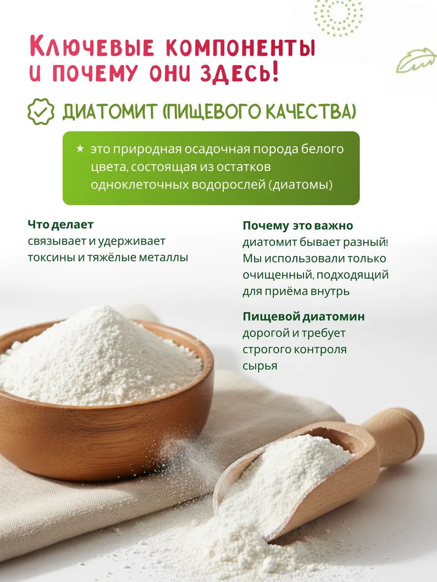 • Диатомит очищенный: Мягко и эффективно выводит токсины, шлаки и тяжелые металлы!