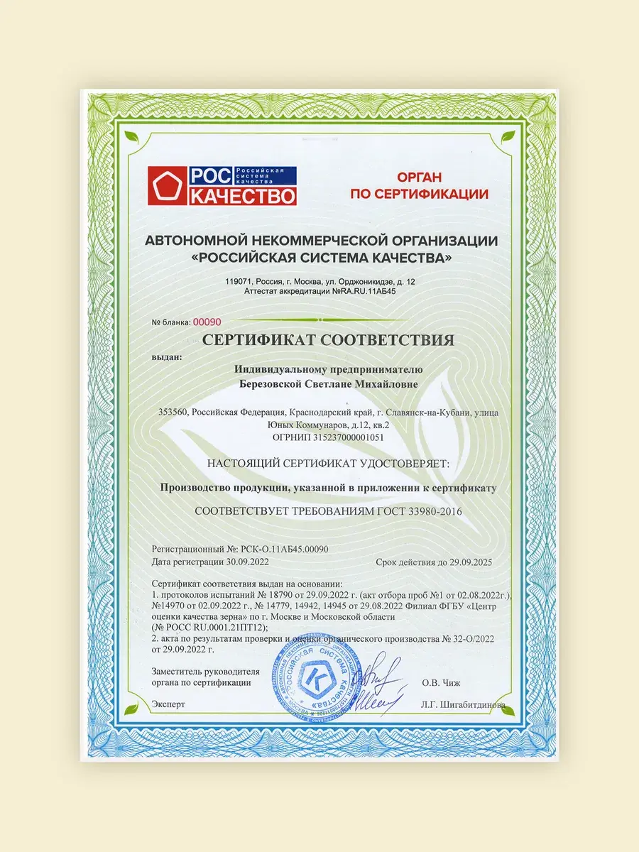 Начиная с момента попадания органического зерна в землю и до упаковки готового продукта ни на одном этапе мы не используем никаких гербицидов и химических удобрений.