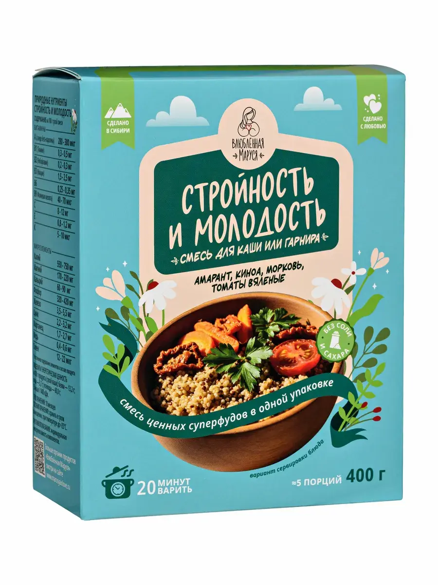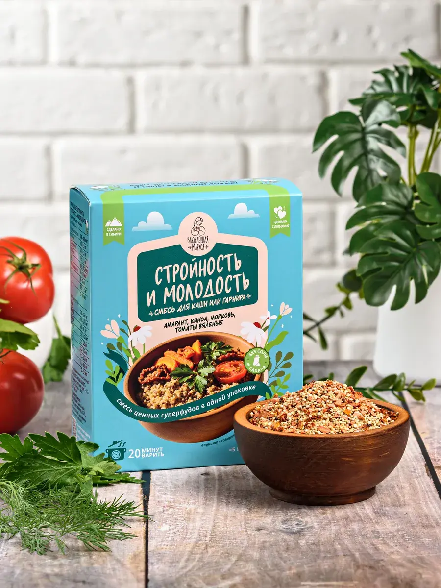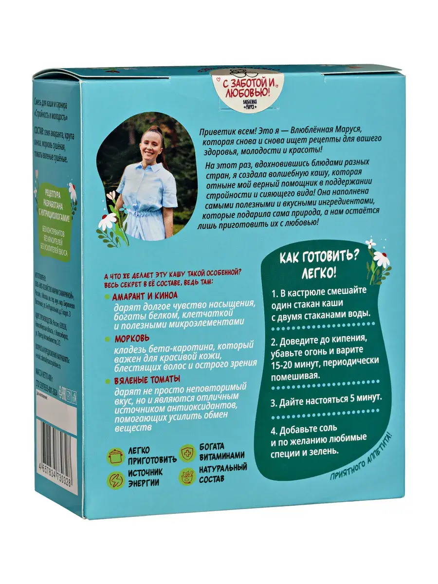 Состав: семя амаранта, крупа киноа, морковь сушеная, томаты вяленые сушеные