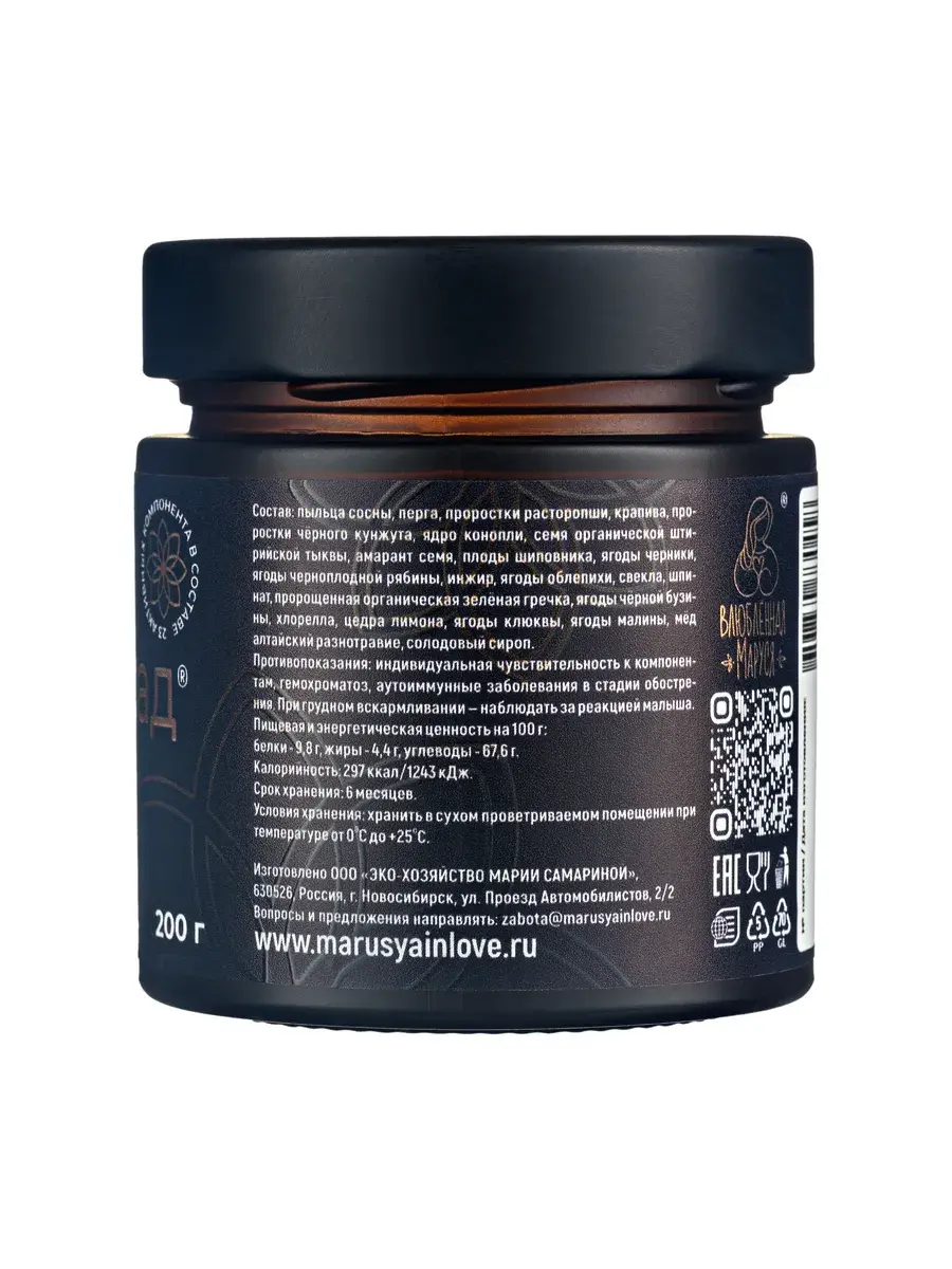 Представляю вам мою пасту «Жизнирад» — это моя любовь, воплощённая в каждом ингредиенте: пыльца, перга, проростки, ягоды, водоросли и фрукты соединились, чтобы мягко, но эффективно повысить уровень железа, ферритина и энергии.